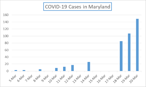 The Maryland state page reporting on COVID-19 contains lots of great information, but it isn’t currently showing how the virus is changing over time in the state. So here’s what I have so far.